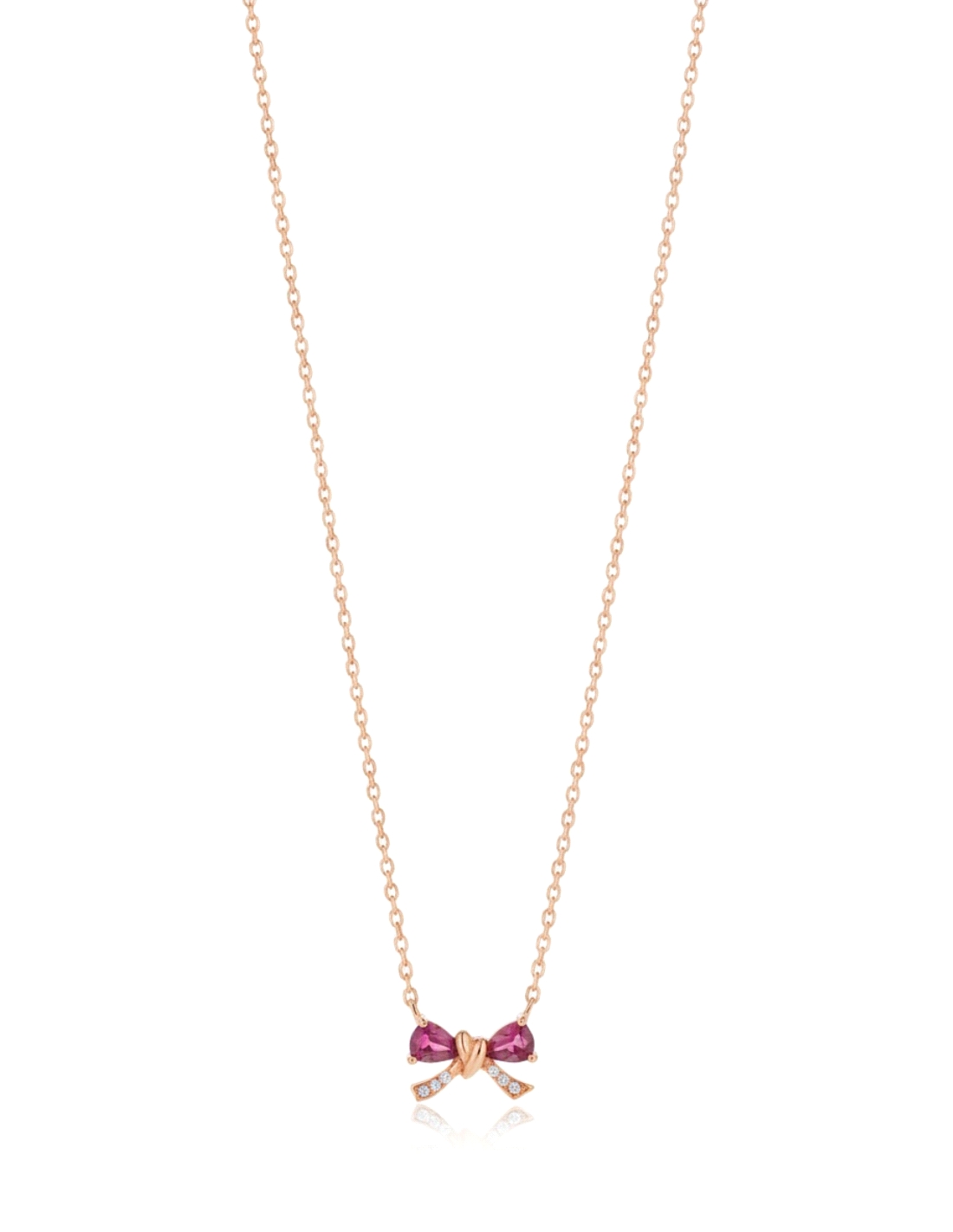 Gargantilla lazo oro primera ley 750mm-18K con Diamantes y rubies. Acabado en oro rosa. Diamantes talla brillante y dos rubies en talla pera de 0,42ct .Largo de la cadena 41cm. Cierre de mosquetón ancho extraplano